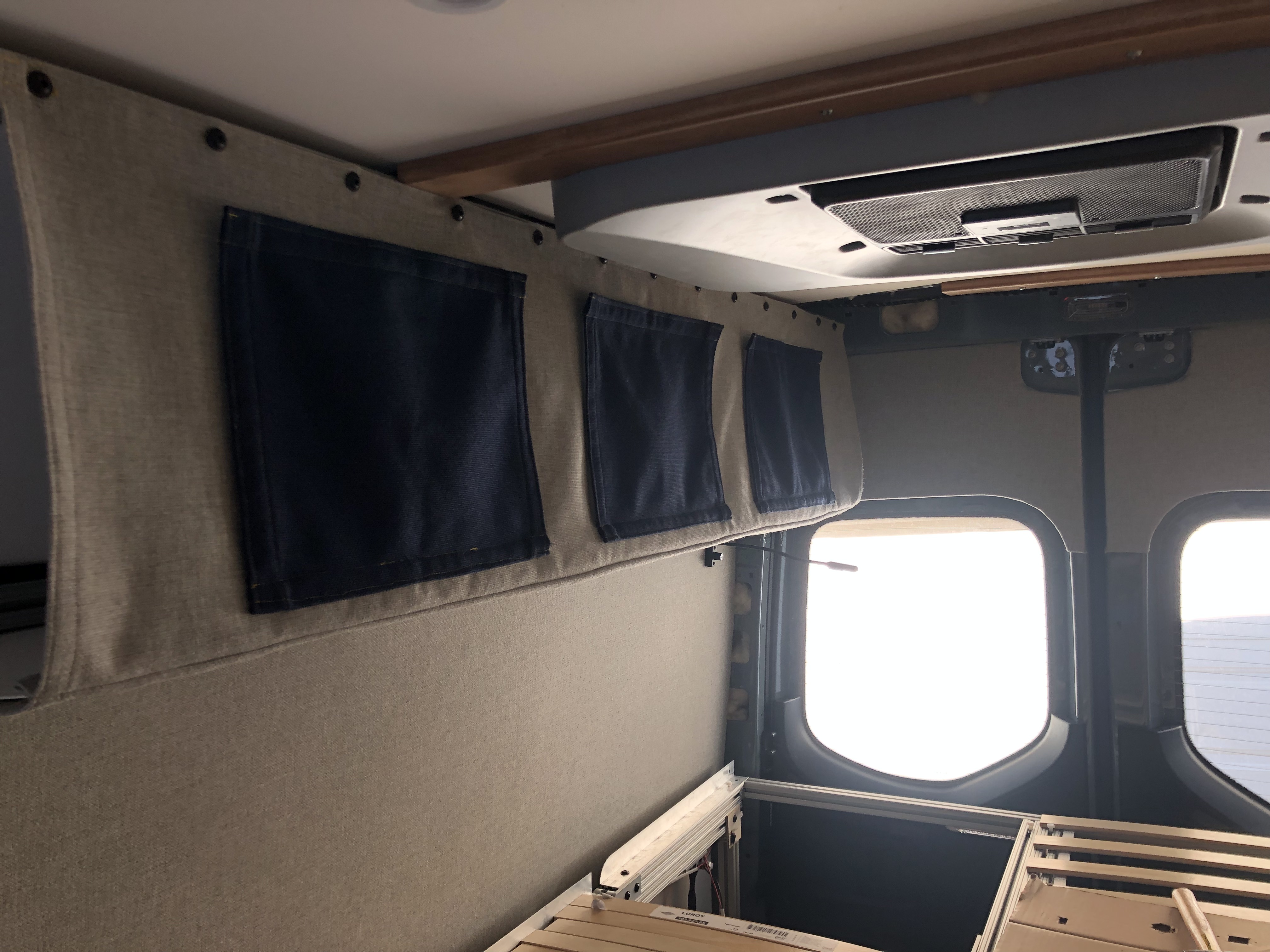 Speaking of bedside, am I very pleased with my above-bed storage innovation. Despite having watched dozens of van buildout videos, we've never seen anyone use flexible shelving in a substantial way. To avoid hitting our heads on a corner of wood or metal, we built hanging pocket-like shelves from gray and blue tweed. By adding a sheet of semi-flexible plastic we were able to add enough rigidity to avoid weight-related warping, and with three large Velcro'ed flaps we have pretty good access to the shelf's contents. The space holds 72x12 inches of clothing, which is definitely enough for Cameron's wardrobe. I expect to have equal (or maybe slightly more space) on the other side in the to-be-constructed storage wall. Luckily, since that is solid construction it will hopefully be a little quicker to put together, since cutting and sewing was a 8+ hour project.